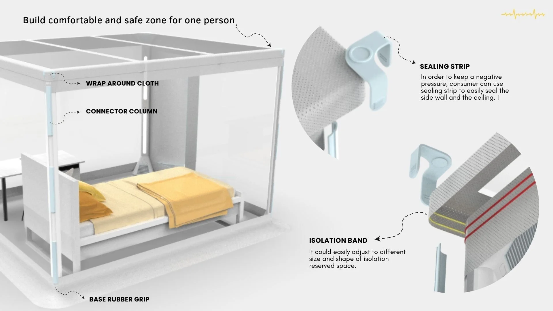 The S.I.T system is engineered with key components including connector columns, wrap-around cloth material, and a secure base rubber grip. Technical features comprise air circulation blades, filtration screens, and strategically placed illumination. Safety considerations are addressed through a specialized sealing strip system that maintains negative pressure and adjustable isolation bands for space customization.